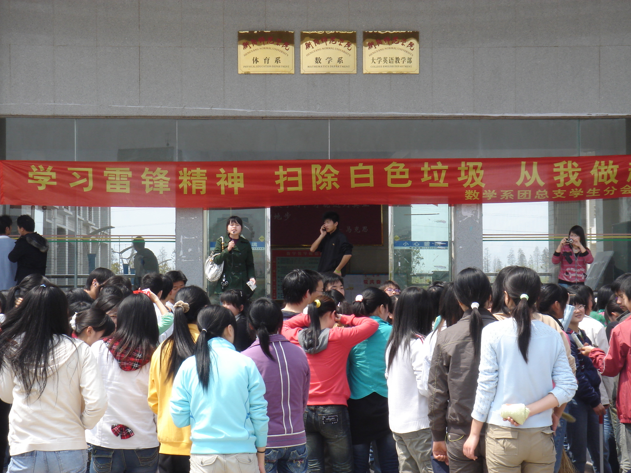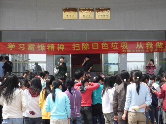 本次学雷锋活动以“学习雷锋精神,扫除白色垃圾,从我做起”为口号,系部号召大家对系内环境来一次彻底清理。12:30,同学们带着各自的清扫工具在数学楼门口集合,在数学系团总支副书记的带领下,开始了各自的劳动。大家分工协助,行动迅速。06级和07级的同学负责清理数学楼各个自习教室及计算机机房,05级的同学则清理数学楼附近的白色垃圾及杂草。