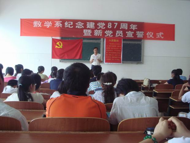 6月27日下午3点,数学系庆祝建党87周年暨新党员宣誓仪式在数学楼505室举行。数学系党总支书记周炎林、系党总支副书记林琼、系团总支书记周璨、系辅导员肖炜及数学系学生党员出席了本次大会。