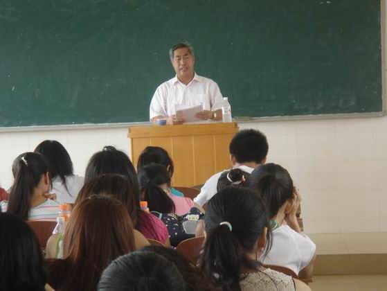(邹校长正在作报告) 9月23日,衡阳县第五中学的邹校长、易校长来我系交流实习工作。交流会在数学教学楼520室举行,学院组织部聂东明部长、数学系杨柳副主任及大四的学生参加了此次交流会。 邹校长作了题为在困境中奋起的主题报告。报告中,他以衡阳县第五中学的艰苦奋斗历程来激励同学们努力拼搏。这对同学们将来如何做好班主任,如何站稳讲台进行了细致指导。这是我系全面实施教学改革、重视实践教学所举行的系列举措之一。 此次交流会对我系学生的实习和就业都将是很好的指导。
