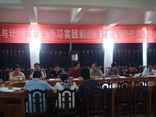 5月26日下午2:30,按照院学习实践活动领导小组的部署,数学与计算科学系党总支召开学习实践科学发展观专题民主生活会。数学与计算科学系领导班子成员周炎林、罗李平、林琼、杨柳等参加会议,并邀请民主党派代表毛旭华,教研室主任高正晖、周勇、阳志锋和实验室主任彭白玉,行政人员代表肖炜列席。院党委组织部副部长赵文斌同志到会指导。 会上,数学与计算科学系党总支书记周炎林同志首先介绍了前一段调研情况和召开民主生活会的前期准备工作。在专题民主生活会之前,数学与计算科学系做了大量的前期准备工作,围绕学习实践活动中要解决的八个突出问题,通过发放调查问卷、召开座谈会、个别访谈等各种形式进行调研,广泛征求了各方面的意见。共发放调查问卷104份,召开座谈会4次,征求意见和建议34条。班子成员之间开展了谈心活动,认真撰写了分析检查报告,初步形成了一批有价值、有份量,具有较强理论性和操作性,对我系科学发展具有指导性的调研成果。 专题民主生活会上,数学与计算科学系班子成员根据师生员工提出的意见和建议,认真查找个人和班子成员在贯彻落实科学发展观方面存在的突出问题,查找个人在党性党风党纪方面存在的问题,并深刻剖析其主观原因,开展批评和自我批评。大家坦诚相对、畅所欲言,整个专题民主生活会气氛非常和谐,且本次民主生活会切实达到了统一思想、促进工作、增进团结和推进科学的目的。