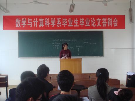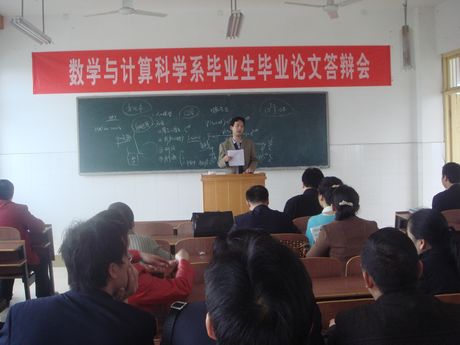 4 月24日上午8:00,数学与计算科学系2010届毕业生毕业论文答辩会在数学教学楼420室举行。数学与计算科学系全体专任教师与2010届毕业生参加了此次答辩会,答辩会由数学与计算科学系副主任杨柳主持。