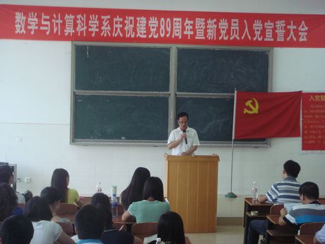 6 月28日上午9:30,数学与计算科学系在数学楼505举行庆祝建党八十九周年暨新党员入党宣誓大会。数学与计算科学系党总支周炎林书记、林琼副书记、系杨柳副主任及全体党员和学生干部出席本次大会。