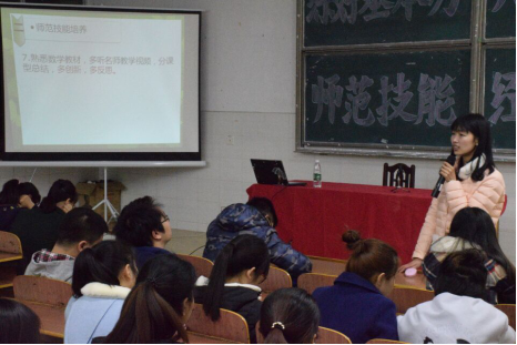 活动在杨烂同学充满激情的自我介绍中拉开帷幕。她结合自身阅历从师范生技能竞赛、技能培养以及就业三方面分享了她的经验。活动中她就师范技能竞赛中的相关流程做了简要介绍,并针对比赛中的有关应急措施提出了有效建议。随后她强调师范生要特别注重语言表达、课堂教态、粉笔字书写、多媒体课件以及授课艺术等技能的培养,并指出这些技能将对师范生今后从事教育行业至关重要。接着她鼓励在座学生多熟悉教学教材,多创新,多反思。随后她就就业方面,也跟在场的同学分享了她的感悟和体会。最后,本次活动在观众与杨烂的亲切互动中落下了帷幕。