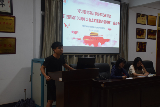 为认真学习贯彻习近平总书记在纪念五四运动100周年大会上的重要讲话,大力弘扬以爱国主义为核心的民族精神,准确把握新时代中国青年的使命,5月23日晚上7点30,我院团委于数学楼三楼会议室召开了“学习贯彻习近平总书记在纪念五四运动100周年大会上的重要讲话精神”座谈会。座谈会由院团委副书记贺文主持,团委书记刘琴老师出席并发表讲话,学生团员代表40余人参加。
