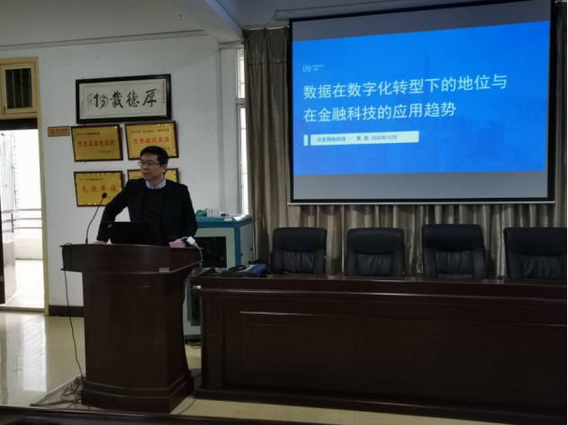 2020年12月9日上午10: 30—12: 00,深圳点宽网络科技有限公司执行董事黄嵩和总经理徐辣应邀来我院讲学与指导,在数学楼学术报告厅作了题为“数据在数字化转型下的地位与在金融科技的应用趋势”专题报告,2018级统计学专业全体学生和学院部分教师共同参加并聆听了此次报告。