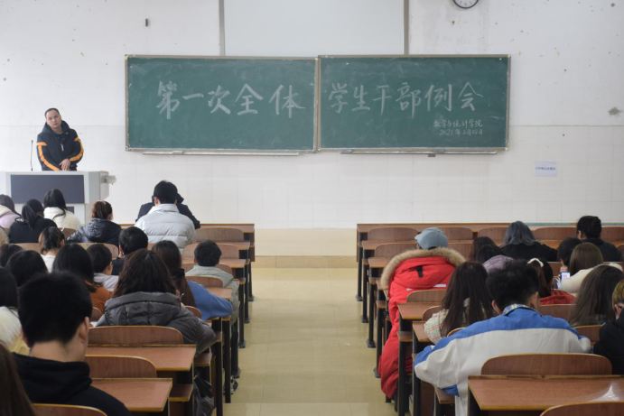 新学期,新气象。2月28日下午4点,我院在数学楼505教室召开了新学期第一次全体学生干部例会。我院党总支副书记谭全球,辅导员刘琴、周长恩、贺妮老师出席本次会议,全体学生干部参加会议。