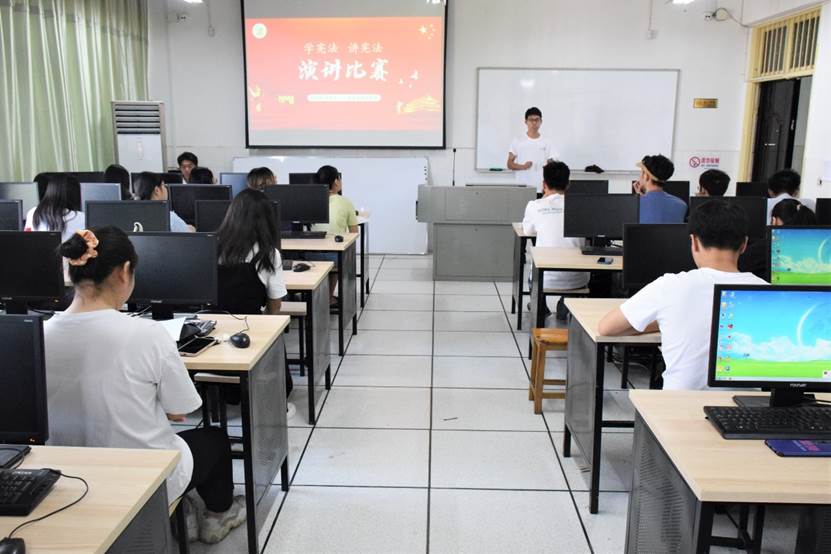 为深入学习贯彻习近平法治思想,考察学生对法治知识的掌握情况,9月21日上午9点,我院于理科楼(1)308教室举办了“讲宪法学宪法”演讲比赛。本次比赛由我院团委学生会各部门部长担任评委,共11名选手参加此次比赛,我院19、20级部分同学到场观赛。