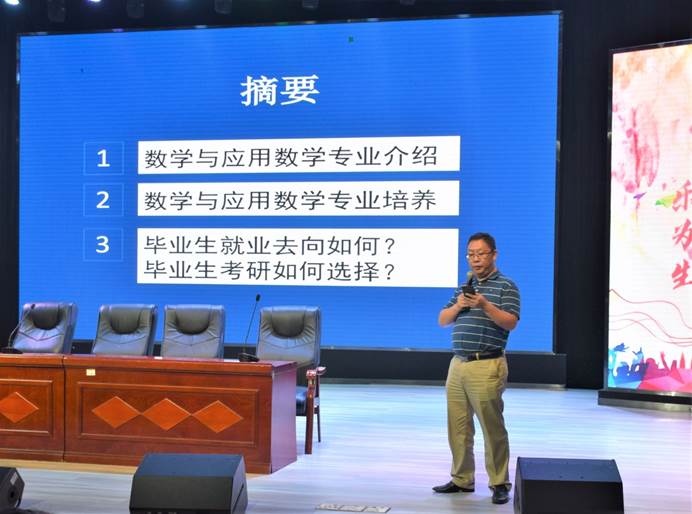 会议伊始,谭书记首先代表我院对全体2020级新生来到学校,开启人生的新篇章表示热烈的欢迎和衷心的祝贺。紧接着,杨家骏书记为大会发表致辞。他先是结合具体数据回顾了我院近几年的发展成果,接着,他鼓励新生尽快融入新环境并对他们即将开始的新生活提出四点希望:一是希望我院新生力量立足家国情怀,充满自信;二是希望同学们有理想,有追求,有大爱;三是希望同学们做好学业规划,合理利用资源;四是希望同学们专注沉着,开拓创新。随后,杨柳院长则从数学的概念入手,对如何学习数学的思想、逻辑、语言以及哲理等方面进行了深入浅出的讲解。他强调数学是所有学科的基础,大家一定要用科学的语言和数学的思维去分析问题,勇攀数学高峰,才能学好数学。最后,谭书记告诫大家奋斗无止境的同时预祝同学们静坐能思,张嘴能说,提笔能写。