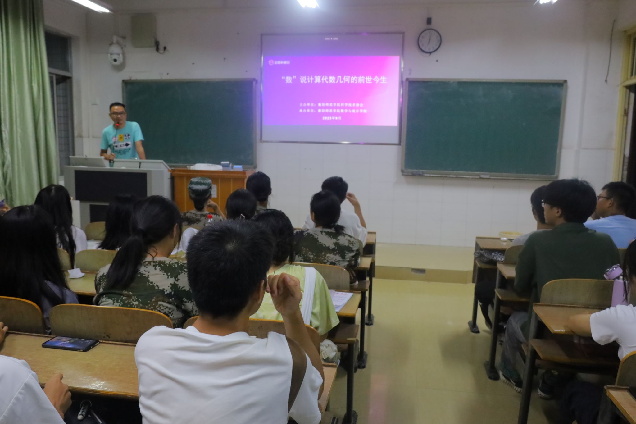 2023年9月27日晚上,在衡阳师范学院科学技术协会的指导下,衡阳师范学院17c起草红桃在数学楼318开展了《“数”说计算代数几何的前世今生》数学科普活动,本次活动由李浏兰副院长主持,梁钝博士主讲,学院数学与应用数学专业百余名学生参加了本次活动。