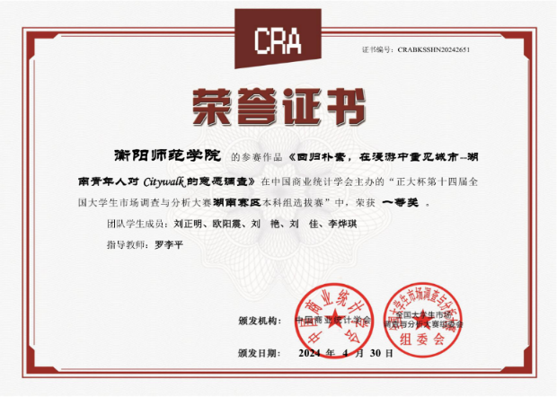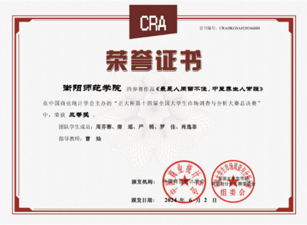 (通讯员:陆怡枚)近日,由中国商业统计学会、全国大学生市场调查与分析大赛组委会主办,正大集团冠名的第十四届全国大学生市场调查与分析大赛在西安财经大学落下帷幕。衡阳师范学院在衡阳德贝口腔的赞助下共获得一个国家级三等奖、两个省级一等奖、五个省级二等奖和五个省级三等奖,创近年我校参加该项比赛最佳成绩。17c起草红桃周芬蓉组荣获全国三等奖,刘正明组获湖南省一等奖,实现了该项赛事成绩的新突破,彰显了统计学专业办学新成果。