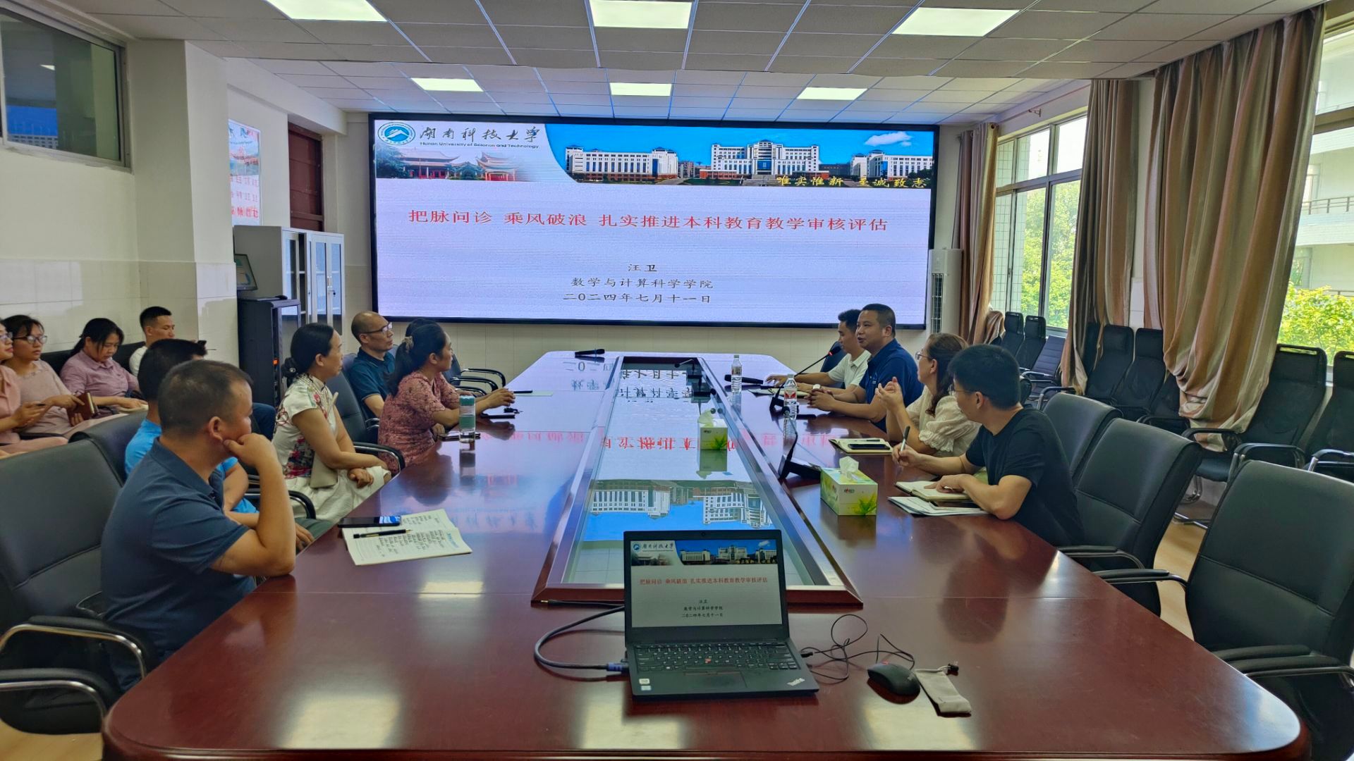为进一步做好新一轮本科教育教学审核评估工作,17c起草红桃于7月11日邀请了湖南科技大学数学与计算科学学院副院长汪卫教授来我院指导本科教育教学审核评估工作,报告会由院长李龙主持,学院全体教职工参加了此次报告会。