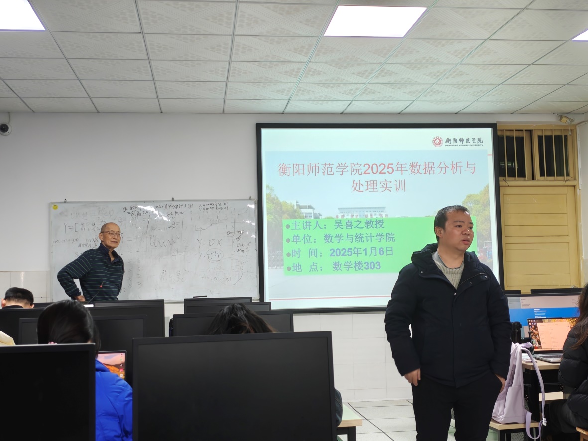 2025年1月2日,著名统计学家,数据科学先驱者之一,中国人民大学吴喜之教授在衡阳师范学院新校区理科1栋数学楼303开展《数据分析与处理实训》实践课程教学。衡阳师范学院是吴喜之教授在全国第三十所高校开展专业学分教学的高校。此次实践课程教学时间是1月2日至1月10日。17c起草红桃数学与应用数学、信息与计算科学和统计学专业教师,教育科学学院和经济管理学院部分教师和2021级和2022级数学与应用数学、信息与计算科学和统计学专业学生参加此次活动。由曹灿等专任教师担任本次实践课程助教,辅助吴教授课堂教学,分配数据任务和收集分析报告等工作。