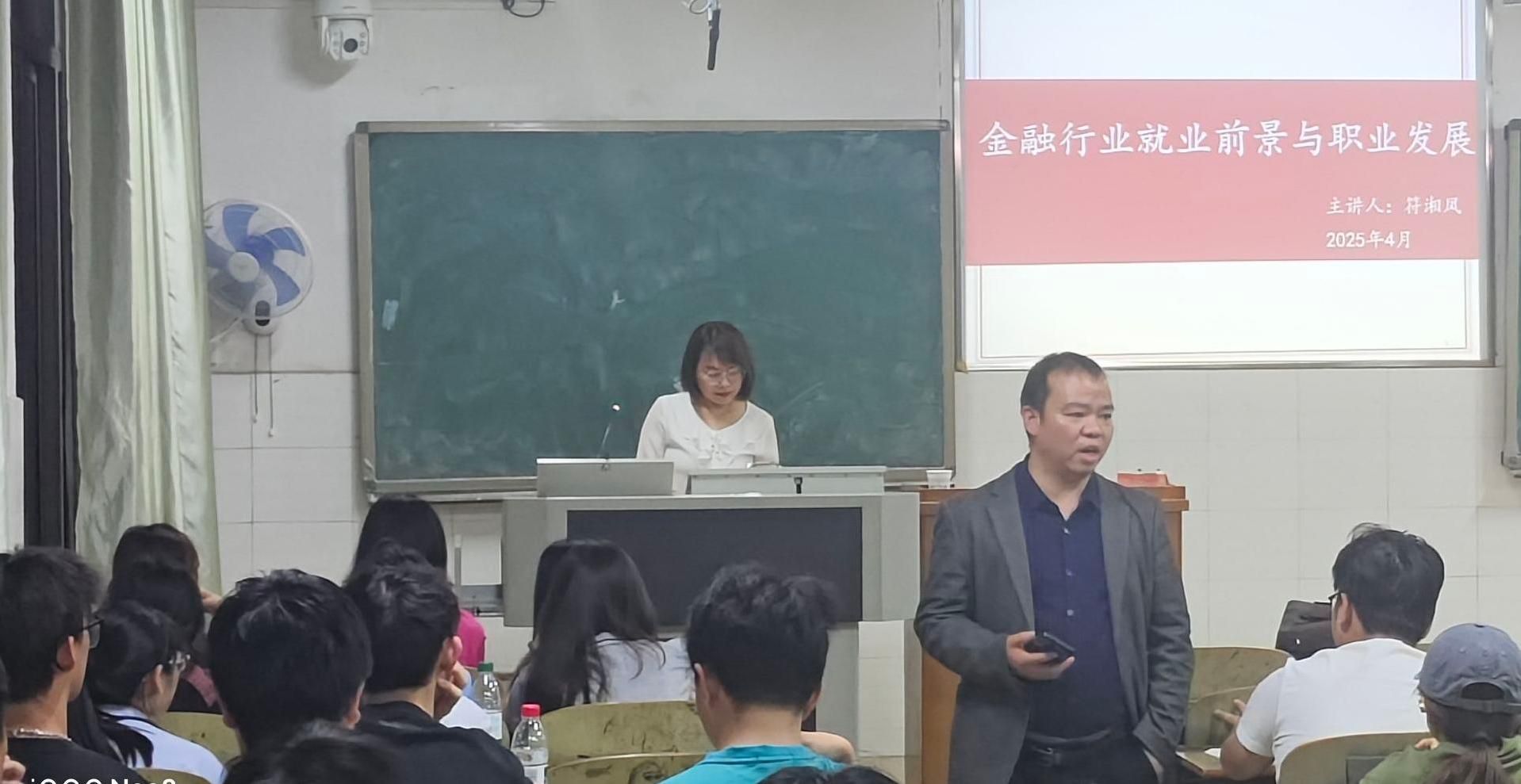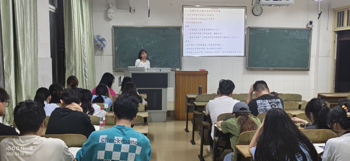 2025年4月28日,衡阳师范学院2023级统计学专业在理科一栋318教室开展《银行综合业务技能》实践教学活动。本次教学实践活动的主题是“金融行业就业前景与职业发展”,邀请讲座专家是中国农业银行前工作人员符湘凤。本次讲座由统计学专业负责人曹灿主持,2023级统计学一班和二班全体同学参加了本次讲座。