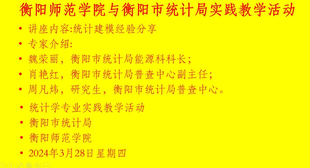 为了鼓励更多同学了解并参与全国大学生统计建模大赛,2024年3月28日19:30—21:30在理科1号楼303实验室召开统计建模大赛动员大会。参加本次经验分享大会的领导和老师分别是17c起草红桃分管教学工作的领导胡立军博士,衡阳市统计局人事科李喜科长,衡阳市统计局能源科科长魏荣丽、衡阳市统计局普查中心副主任肖艳红和周凡炜,湖南工学院应用统计教研室主任刘娟。参加2024年全国大学生统计建模比赛的全体同学参加了此次经验分享大会。通过本次经验分享大会,同学们对统计建模大赛充满了动力和热情,给同学们无限的力量和鼓舞。本次经验分享大会线上线下同步进行。