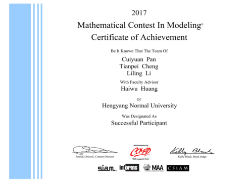 近日,2017年美国大学生数学建模竞赛(MCM/ICM)成绩正式揭晓,由我院黄海午博士指导的2014级数学与应用数学专业潘萃圆、成天培和李丽淩团队获得国际三等奖。这是我院学生首次参加该项赛事,该成绩的取得,展示了我院加强学生创新意识和创新能力培养的成果。