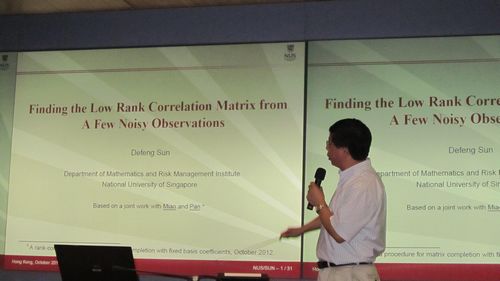 国际优化和风险管理著名学者,美国Washington大学的Rockafellar教授参加了此次会议,并作了“Random variables and convex analysis”的主题讲座。来自英国、新加坡、日本、香港和中国内地的40多位优化和风险管理的学者参加了为期两天的会议,会议共有14个报告。我院海外名师Defeng Sun教授和童小娇教授参加了此次大会,并分别作了“Finding the low rank correlation matrix from a few noisy observations ”和“Stochastic programming arising from economic dispatch with reliability risk constraint in smart grid”的40分钟大会报告。会议期间与会代表进行了优化理论和方法、风险管理与分析等相关问题的深入讨论和交流。