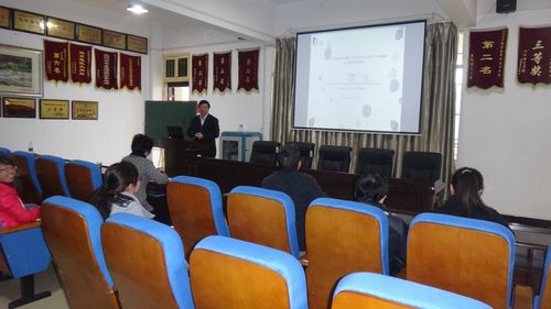 (报告会现场) 11月30日上午在数学楼312室新加坡国立大学孙德锋教授作了题为“Matrix Programming: A New Research Paradigm in Optimization”的学术报告。数学与计算科学系、计算机科学系和经济与法律系部分老师参加了报告会。报告会由副院长童小娇教授主持。 孙教授用通俗易懂的语言介绍了线性优化的定义与历史、矩阵优化、矩阵锥优化、半正定优化等的概念与性质。 报告后,参会的老师还就相关学术问题与孙德锋教授进行了深入交流。