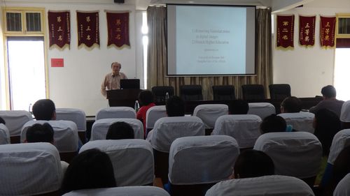 刘教授首先从高斯噪声基本模型和加权均值滤波器等基本思想和概念入手,深入浅出地介绍了他们提出的非局部均值滤波权值优化方法去除数字图像中的高斯噪声,并通过大量数值实验验证了算法的的有效性。该学术报告结束后,刘教授从法国的经济与文化和法国南布列塔尼大学的概况谈到了法国的高等教育,并就申请到法国留学的相关事宜给与会师生作了详细的介绍,随后回答了师生们提出的相关问题,与会师生受益匪浅。