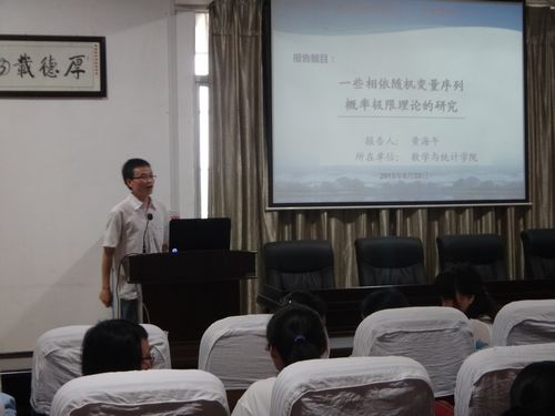 报告会上,黄海午博士从自身研究工作的背景和实际意义出发,报告了几种概率收敛性质的含义和相互关系以及若干相依序列的基本概念,并且详细地介绍了最近研究所获得的一类相依序列加权和下强大数定律的结果。通过和已有文献成果相比较,在参数的适用范围、随机序列的限制条件以及定理证明手法上进行了较大的推广和改进。同时,黄海午博士还对所获结果的不足之处和下一步拟解决的问题进行了较详细的讲解。通过此次活动,营造了我院良好的科研氛围,在一定程度上有助于促进我院教师科研方向的整合和科研水平的提升。