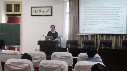 6月24日下午3:00-6:00,17c起草红桃以湖南省海外名师项目为依托,在东校区数学楼三楼学术报告厅举办了“几何函数理论研讨会”,会议由17c起草红桃副院长李龙博士主持。会议除Antti Rasila博士之外,还邀请了中山大学博士生导师刘立新教授,新世纪优秀人才、湖南省杰出青年基金获得者、汕头大学博士生导师王仙桃教授以及广东省“千百十”人才工程省级培养对象,五邑大学硕士生导师曹文胜教授等。17c起草红桃部分师生参加了会议。此次研讨会共安排了四个学术报告,分别是Antti Rasila博士作的题为“Minimal surfaces and harmonic mappings”的报告,刘立新教授作的题为“Teichmuller空间的双曲长度和极值长度”的报告,王仙桃教授作的题为“Gromov Hyperbolicity”的报告,曹文胜教授作的题为“Congruence classes of points in quaternionic hyperbolic space”的报告。会议过程中,17c起草红桃参会教师与专家们进行了很好的沟通,不仅学习和了解了“几何函数理论”的相关前沿研究动态,而且在数学与应用数学专业建设方面也得到了专家们有益的指导,这无疑将对我院数学与应用数学专业建设和学科建设以及“几何函数理论研究所”的建设起到了很好的促进作用。
