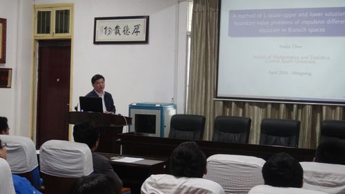 随后下午4点,在数学楼学术报告厅,中南大学博士生导师陈海波教授作了题为“脉冲常微分方程边值问题—L拟上下解方法”的学术报告。陈教授首先概述了微分方程模型的求解、微分方程与函数的转化、微分方程边值问题与积分方程的转化、上下解方法、拟上下解方法等概念,然后阐述了L拟上下解方法在一类脉冲常微分方程边值问题中的应用,获得该方程上下解的存在性、原方程解的存在性与唯一性,并给出了误差分析,最后,陈海波教授简单介绍了中南大学研究生招生情况,对我院学生的专业学习、考研及就业提出了许多有指导性的意见!