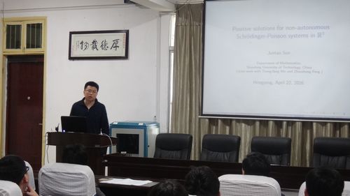 4月22日下午3点,在数学楼三楼学术报告厅,山东理工大学孙俊涛博士作了题为“Positive solutions for non-autonomous schrodinger-poisson systems in ”的学术报告。孙博士首先简单介绍了schrodinger-poisson系统的物理背景意义和变分结构,然后讲述了现有自治和非自治的schrodinger-poisson系统主要结果,最后建立新的变分结构和一些分析技巧等,获得了非自治的schrodinger-poisson系统正解的存在性和多解性,所得结果推广和改进了已有文献中的一些结果,且与之进行了比较。在报告过程中,孙博士还就如何发现问题及进一步可做的问题进行了深入的阐述,与会师生受益非浅。