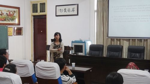 随后袁沅教授作了题为“A Prey-Predator Model with Migrations and Delays”的学术报告。她首先概述了捕食者-食饵模型研究现状和生物背景意义,然后考虑在两个区域迁徙情形下获得该捕食者-食饵模型的平衡点存在性和一致持久性及数值模拟;最后对我院教师出国访学给予指导!