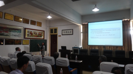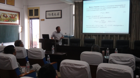 此次研讨会共安排了7个学术报告,分别是Kalaj David教授作的题为“On Nitsche’s conjecture and Quasiconformal harmonic mappings”的报告,王仙桃教授作的题为“Gromov hyperbolicity and inner uniformity”的报告,袁文俊教授作的题为“涉及微分多项式及分担值的亚纯函数的正规性”的报告,陈少林博士作的题为“Distortion and covering theorems on pluriharmonic mappings”的报告,黄曼子教授作的题为“Quashiconformal mappings from uniform domains onto John domains”的报告,Antti Rasila教授作的题为“Quasihyperbolic metric: history and applications”的报告和刘名生教授作的题为“Starlike functions and their applications in signal analysis”的报告。
