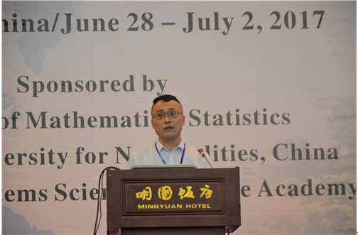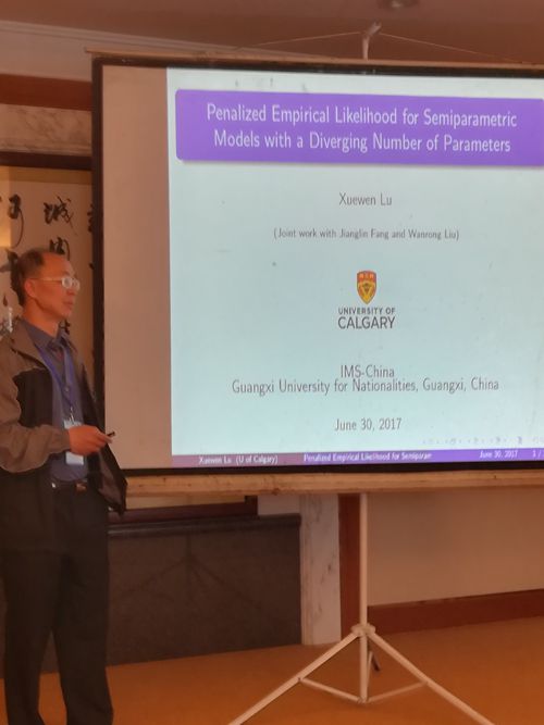 2017年6月28日-7月2日,由国际数理统计学会中国分会(IMS-China)主办、广西民族大学承办的“2017年IMS-China概率统计国际学术研讨会”在广西南宁召开。来自美国、瑞士、英国、加拿大、印度、新加坡和我国大陆、香港等高校与科研院所的320余位专家和学者参加本次学术研讨会。依托2017年度湖南省引进海外人才与智力项目计划,湖南省海外名师加拿大卡尔加里大学统计学专业博士生导师卢学文(Xuewen Lu)教授和我院黄海午博士也应邀参加了此次会议。