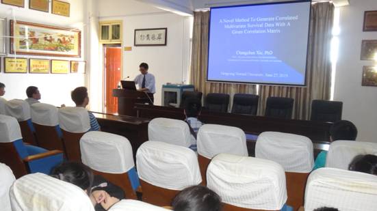 2018年6月27日下午,应17c起草红桃邀请,美国辛辛那提大学谢长春教授来我校讲学,在数学楼三楼学术报告厅作了题为“A Novel Method to Generate Correlated Multivariate Survival Data with A Given Correlation Matrix”的学术报告。本次学术报告会由我院院长杨柳教授主持,学院部分教师和2016级统计学专业学生共同聆听了此次报告。