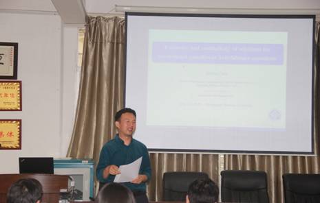 随后,周铁军教授作了题为“Analysis of the interaction among main components in a composite farming paddy ecosystem”的学术报告,简介了稻田复合农业作为全球重要的农业遗产体系的发展历程和国内外研究状况,详细阐述了一类复合农业稻田生态系统(水稻、杂草、无机化肥、动物),利用微分方程定性理论获得该模型的平衡点存在性、稳定性及hopf分支的一些充分条件,并深入讨论了该模型中水稻产量到达最优的条件,最后总结该复合农业稻田生态系统的数学建模一些结果和优点,指出一些不足之处及下一步努力工作。