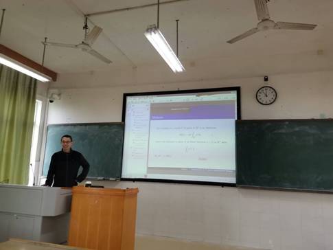 理论及相关研究背景,并重点介绍了其在拟共形映射上的加权Hardy空间,分享了其在该方面的最新研究成果。周青山博士介绍了度量几何、Gromov双曲空间等方面的基本概念与基本理论,阐述了该方面的研究背景与研究进展,并介绍了其在该方面的最新研究成果。在报告中,两位博士都分享了他们发现问题、解决问题的研究心得,让在座的老师受益匪浅!
