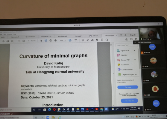 10月23-24日下午,17c起草红桃邀请了黑山大学的David Kalaj教授作了两场线上学术报告。David Kalaj教授利用腾讯会议(ID: 945795722和ID:181221661)作了“Curvature of minimal graphs”的学术报告。陈少林教授主持了报告会,学院领导李浏兰副院长出席,学院多位教师与学生参会。David Kalaj教授首先介绍了有关调和映射的极小曲面曲率猜想提出的背景及研究现状,然后报告了他最近围绕此猜测所做的工作,特别是证明了此猜测在对称点的情形是正确的。报告结束后,David Kalaj教授与师生们进行了热烈的讨论与交流。David Kalaj教授的报告深入浅出,与会师生受益良多,学术讲座在热烈的掌声中圆满结束。