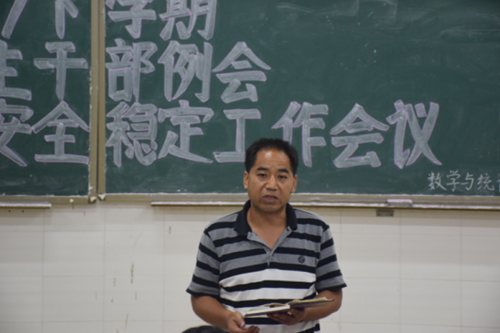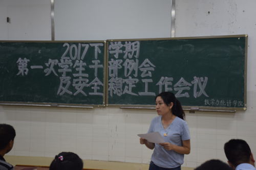 8月31日晚,我院在数学楼505教室召开2017年下学期第一次学生干部例会暨安全稳定工作会议。学院党总支书记邹梅山、副书记谭全球、辅导员刘琴、刘志刚老师出席会议。全体学生干部参加了本次会议。