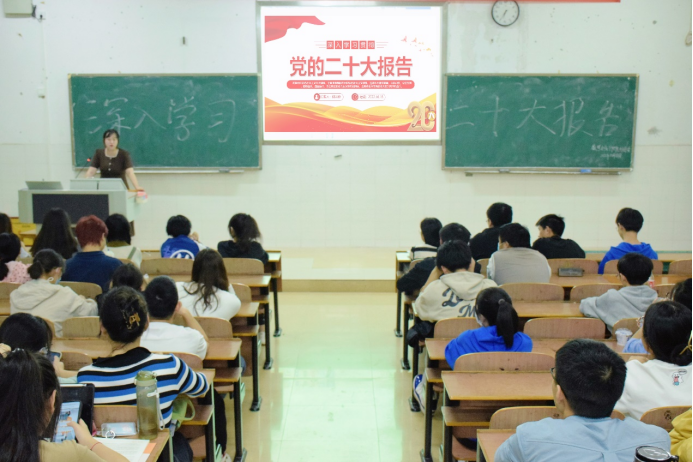 为深入学习党的二十大报告精神,高举中国特色社会主义伟大旗帜,全面贯彻新时代中国特色社会主义思想,弘扬伟大建党精神,坚定我院青年学子的信念追求,增强学生们的责任感、使命感,我院于2022年10月18日晚18点15分在理科楼(1)505教室召开“深入学习二十大报告”主题团课,本次团课由我院团委书记谢炎伶老师主讲,20-21级优秀共青团员以及优秀共青团干部到场聆听。