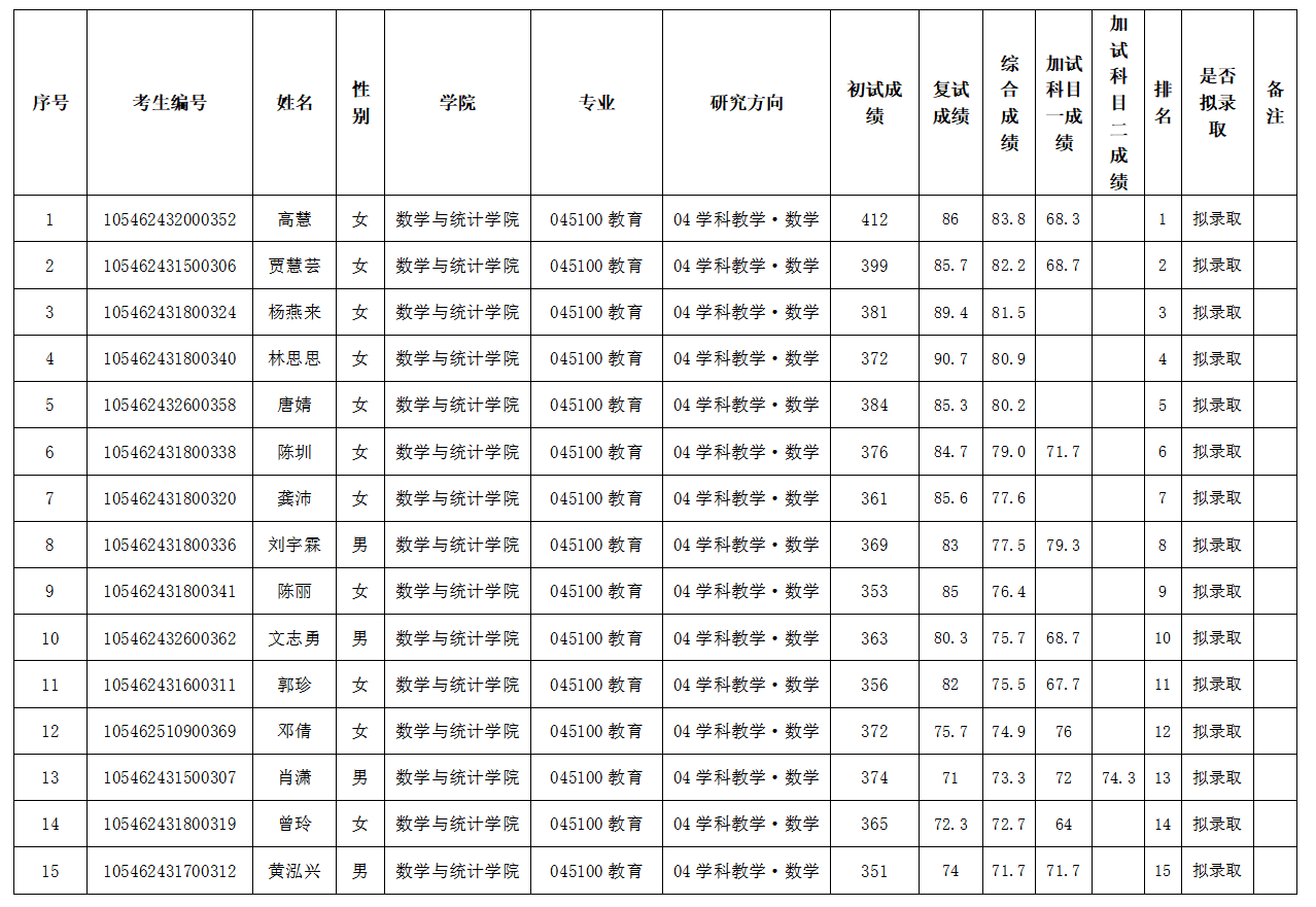 衡阳师范学院数学与统计院2022年硕士研究生一志愿考生复试结果公示