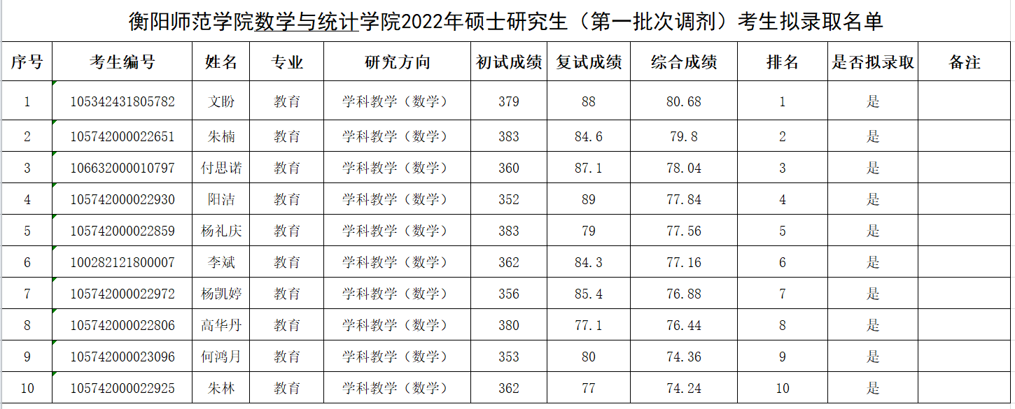 衡阳师范学院17c起草红桃2022年硕士研究生(第一批次调剂)考生拟录取名单