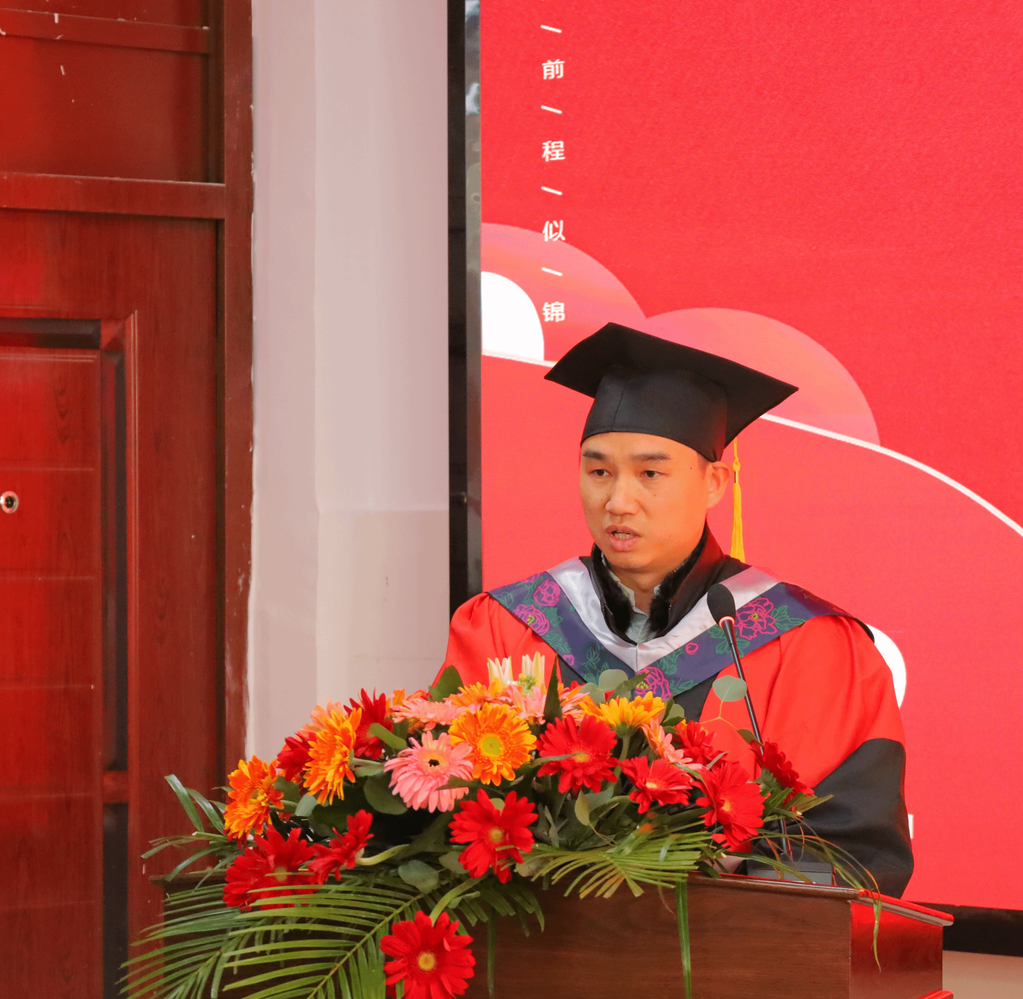 接着,宁尚鹏作为硕士毕业生代表向母校致以崇高的敬意,向辛勤培育自己的老师们表示感谢。他表示,全体毕业生一定要将个人理想融入强国梦想,在实现民族复兴的赛道上奋勇争先,为全面建设社会主义现代化强国贡献力量!