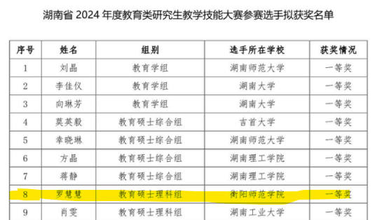 近日,湖南省教育厅公布了2024年度教育类研究生教学技能大赛获奖名单,我院选派的3名学子不负众望,在与全区多所院校的激烈角逐下,脱颖而出,取得优异成绩,共荣获一等奖1项、二等奖1项、三等奖1项。