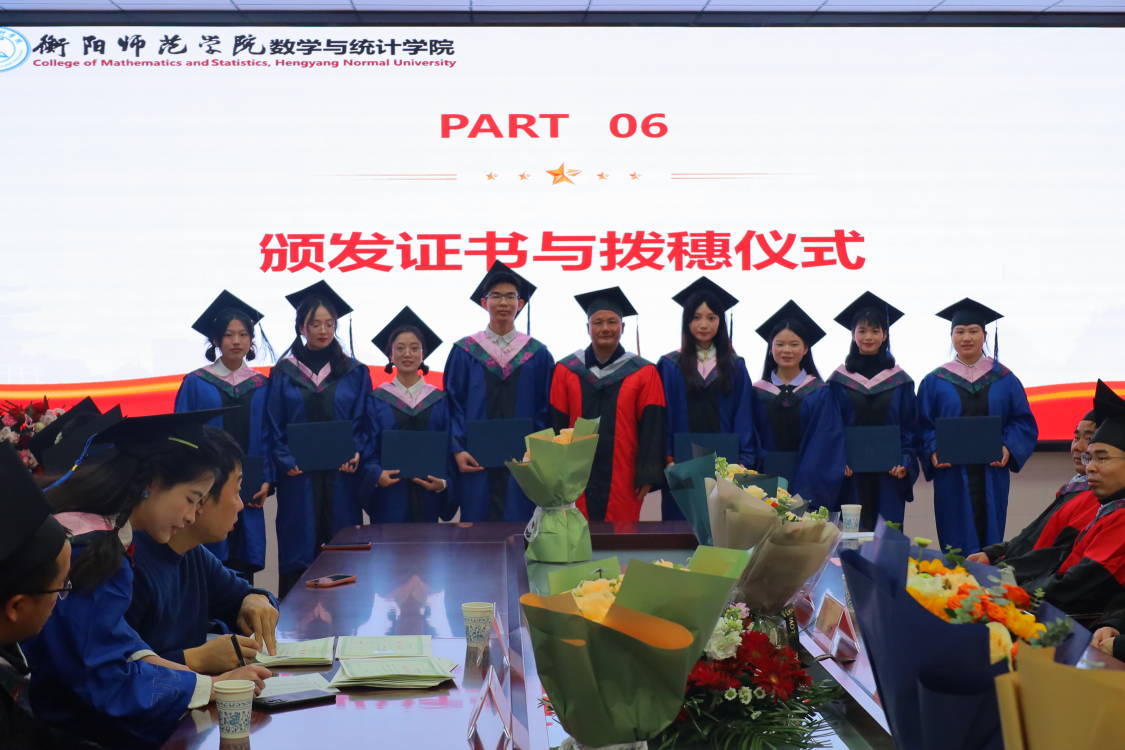 拨穗象征着成熟,代表着毕业生们硕果累累、学业有成。学位授予仪式上,分管研究生工作副院长李浏兰宣读学位授予名单,聂东明副校长为毕业研究生扶拨流苏并颁发毕业证书与学位证书,最后合影留念。