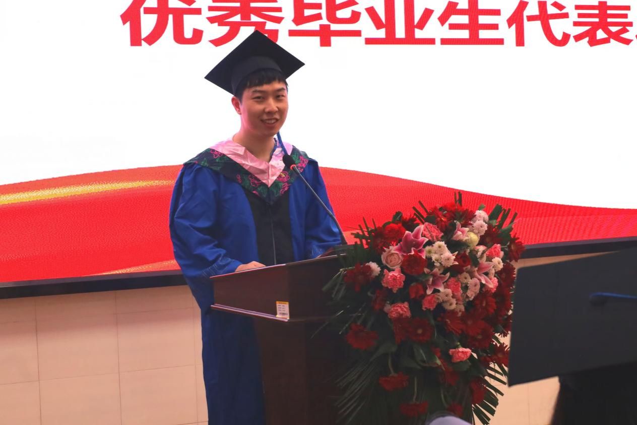 接着,优秀硕士毕业生代表刘宇霖上台发言。他回顾了在校期间的学习与生活,表达了对母校和老师们的感激之情。他指出,青年一代应用实际行动践行强国有我的铮铮誓言,为学校发展和国家教育事业贡献自己的力量。