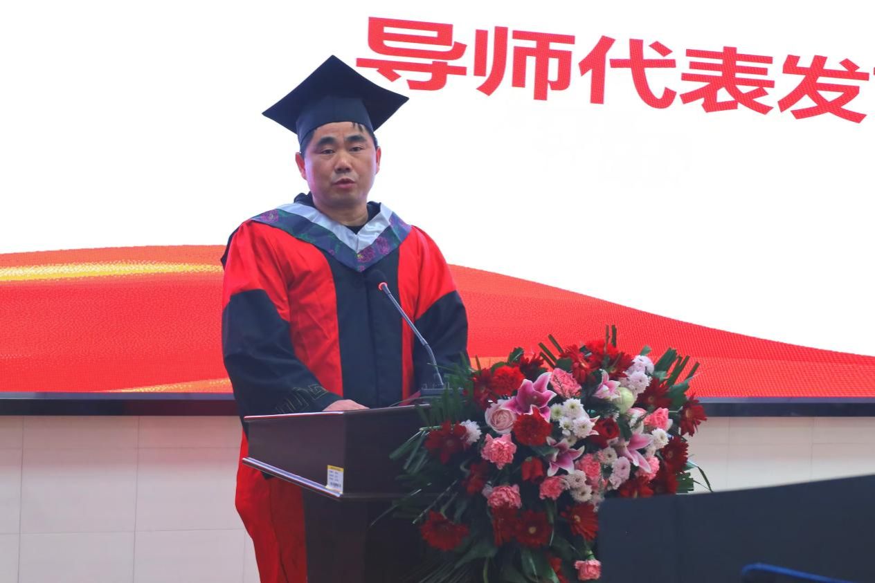 随后,导师代表吴雄韬教授发表讲话。他向即将踏入社会的研究生们送上了最真挚的祝福和希望:第一,要健康快乐地面对生活;第二,要全力拼搏,实现人生理想;第三,要学会感恩,做一个知恩图报的人;最后,要阳光灿烂,迎接未来。