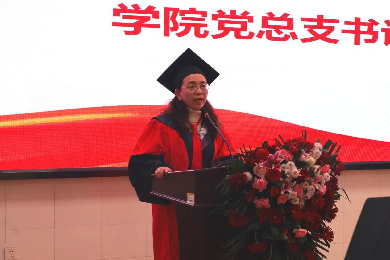 本次毕业典礼在庄严的国歌声中拉开帷幕。党总支书记彭巧燕发表了热情洋溢的致辞,她向全体毕业生表示热烈祝贺、肯定了他们在学术研究和社会实践中取得的优异成绩,并向他们提出“四个坚持”——坚持心怀宏愿始行远,坚持奋斗阔进方有成,坚持勇毅阔步向未来,要心怀“不破楼兰终不还”的决心,拥有“遇山开路,遇水架桥”的耐力,能在风雨后见彩虹,征服人生路上的一座座险峰。